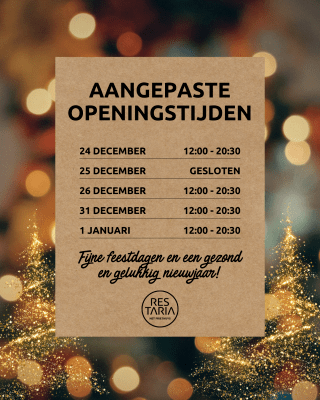 Mogen wij jullie vragen om zoveel mogelijk je bestelling online te plaatsen via: https://shop.e-food.nl/kaatsheuvel/restaria-kaatsheuvel. Hierdoor kunnen we een lange wachtrij in de zaak voorkomen. Wij bezorgen in postcodegebieden 5171 en 5172. Minimaal bestelbedrag is €15,00, bezorgkosten €2,50.
